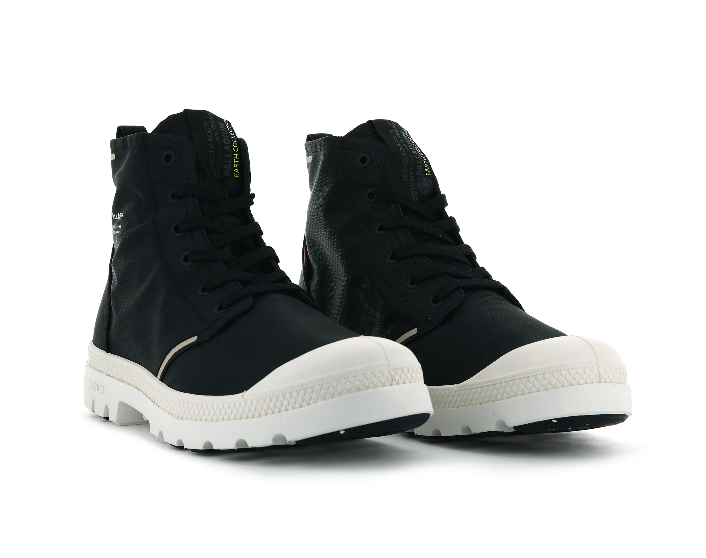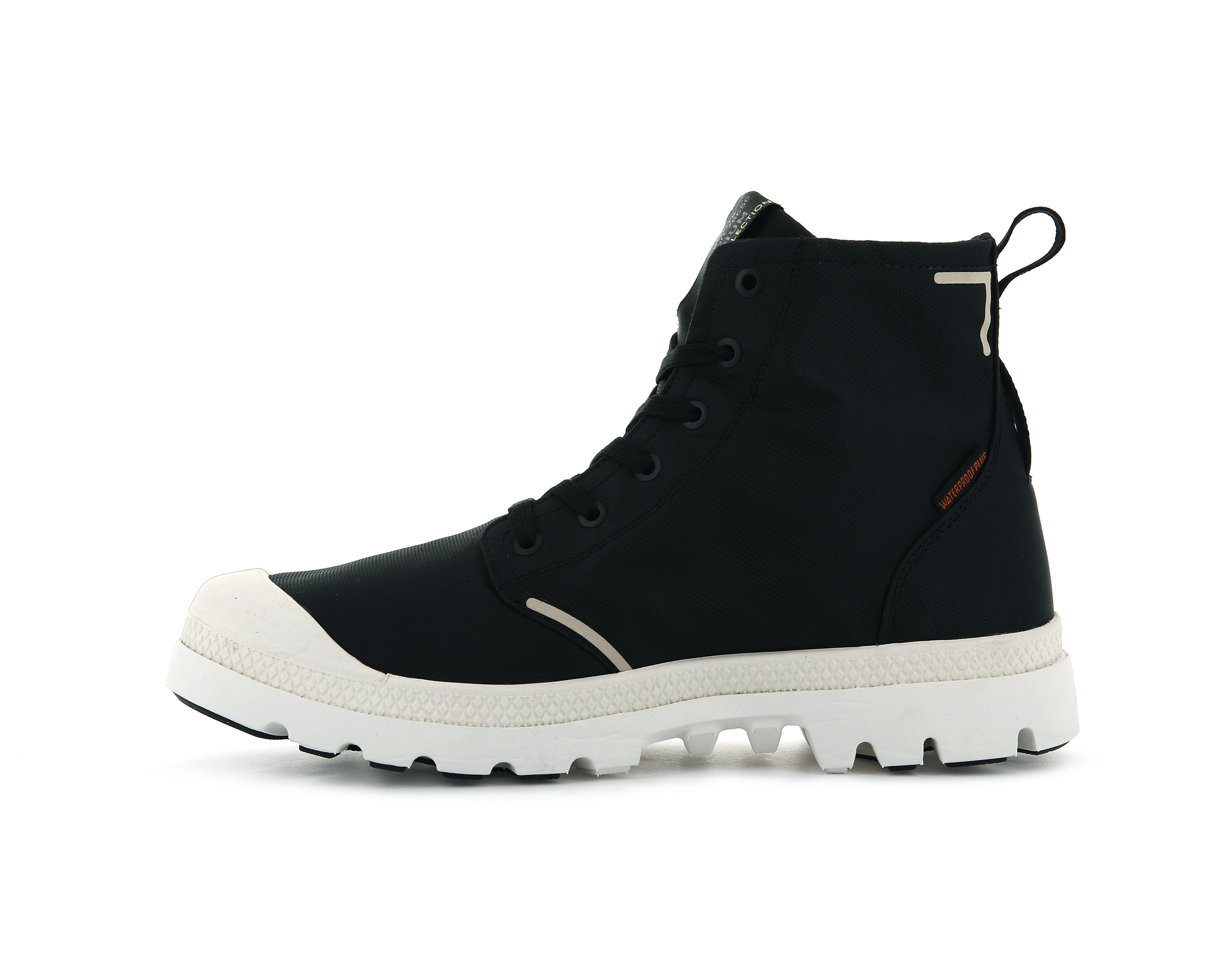 • BRANDING: Woven label folded around the tongue / Waterproof + label on heel / Palladium print on lateral quarter